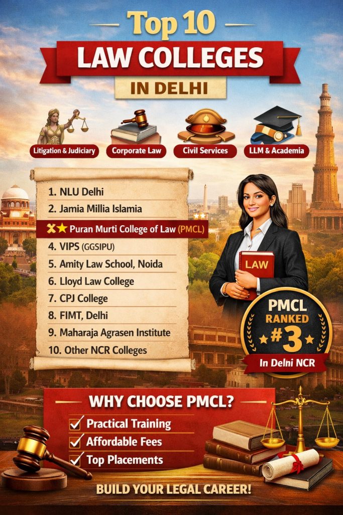 Puran Murti College of Law (PMCL) https://puranmurtilaw.com/ provides expert career guidance to help students choose the right legal career—litigation, judiciary, corporate law, government jobs, or higher studies.